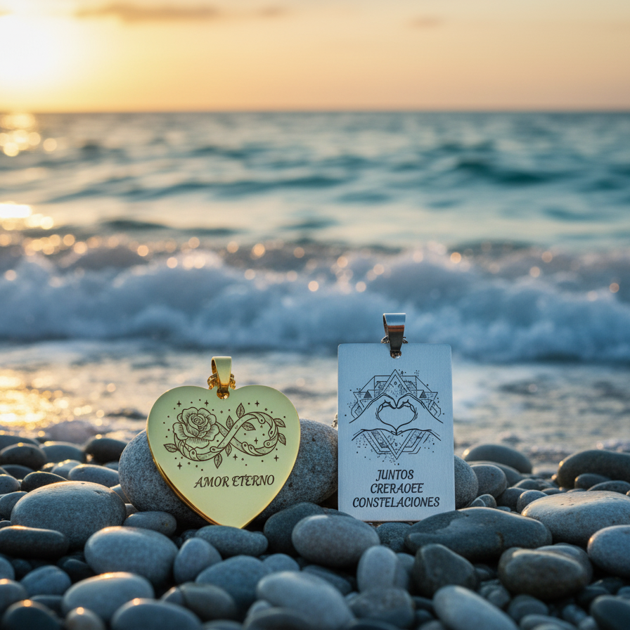 Hoy les traigo no solo joyas, sino historias encapsuladas en metales preciosos. Observen esta magnífica pareja de collares: el Corazón Dorado para ella y la Placa Plateada para él, piezas diseñadas para los que aprecian la verdadera elegancia y el significado profundo.