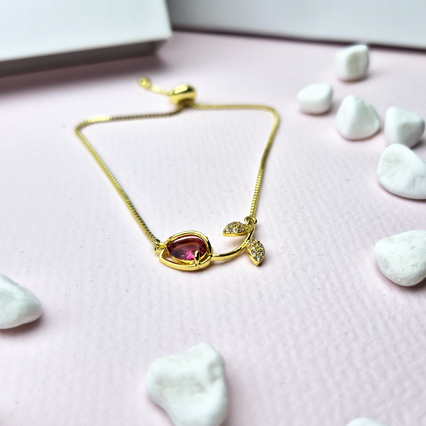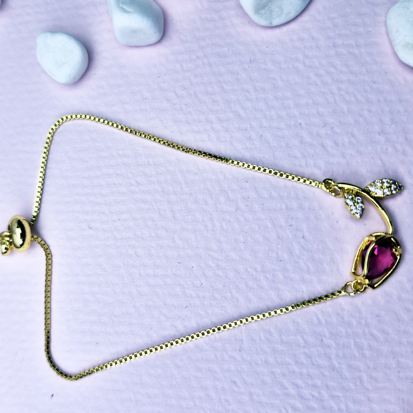 Un Toque de Color y Brillo Vibrante: El tono fucsia de la gema principal es audaz y femenino, añadiendo un pop de color a cualquier conjunto. Los pequeños cristales en las hojas añaden un brillo sutil pero deslumbrante, haciendo de esta pulsera un punto focal de elegancia.